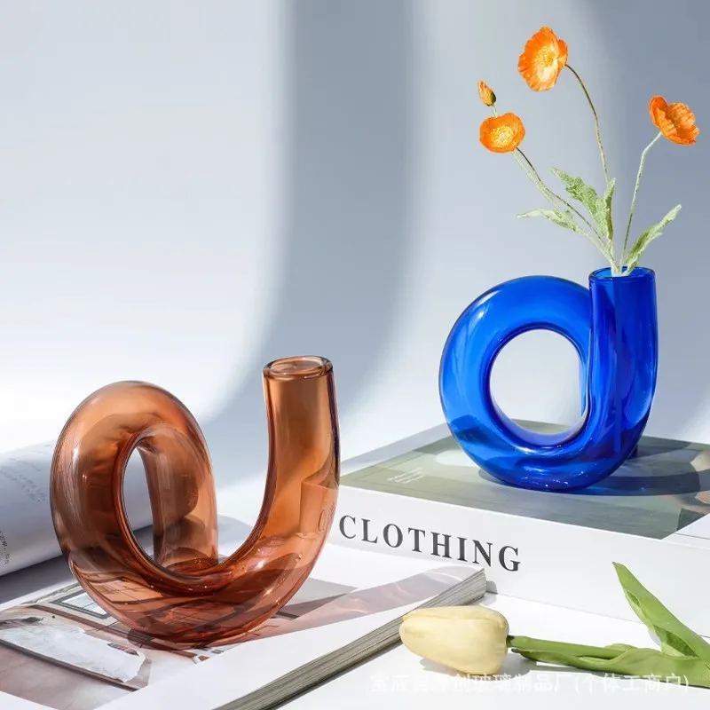 The unique curved silhouette creates a visually captivating piece, serving as both a functional vase and a decorative art object.