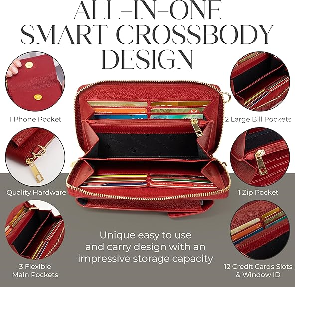 Designed with functionality in mind, it fits phones up to 6.5 inches and includes organised compartments for cards, coins, cash, passports, tickets, and more — keeping everything perfectly in place.